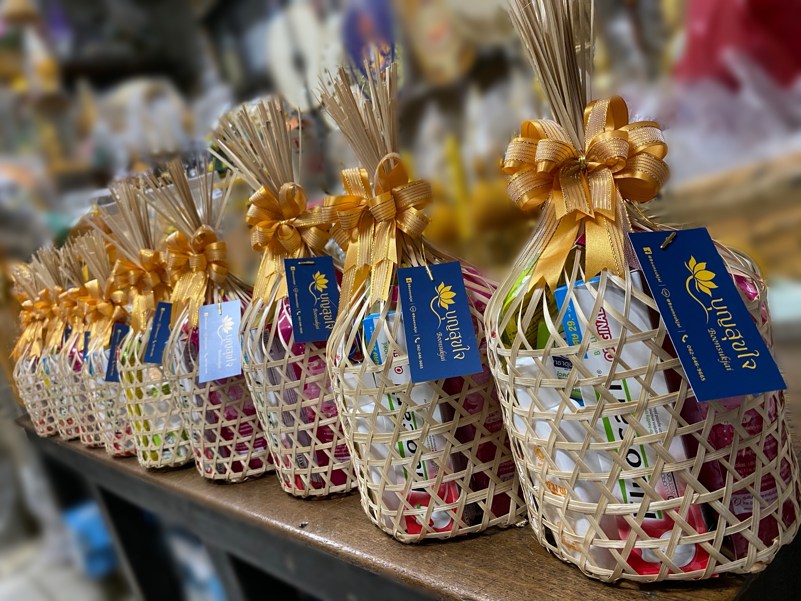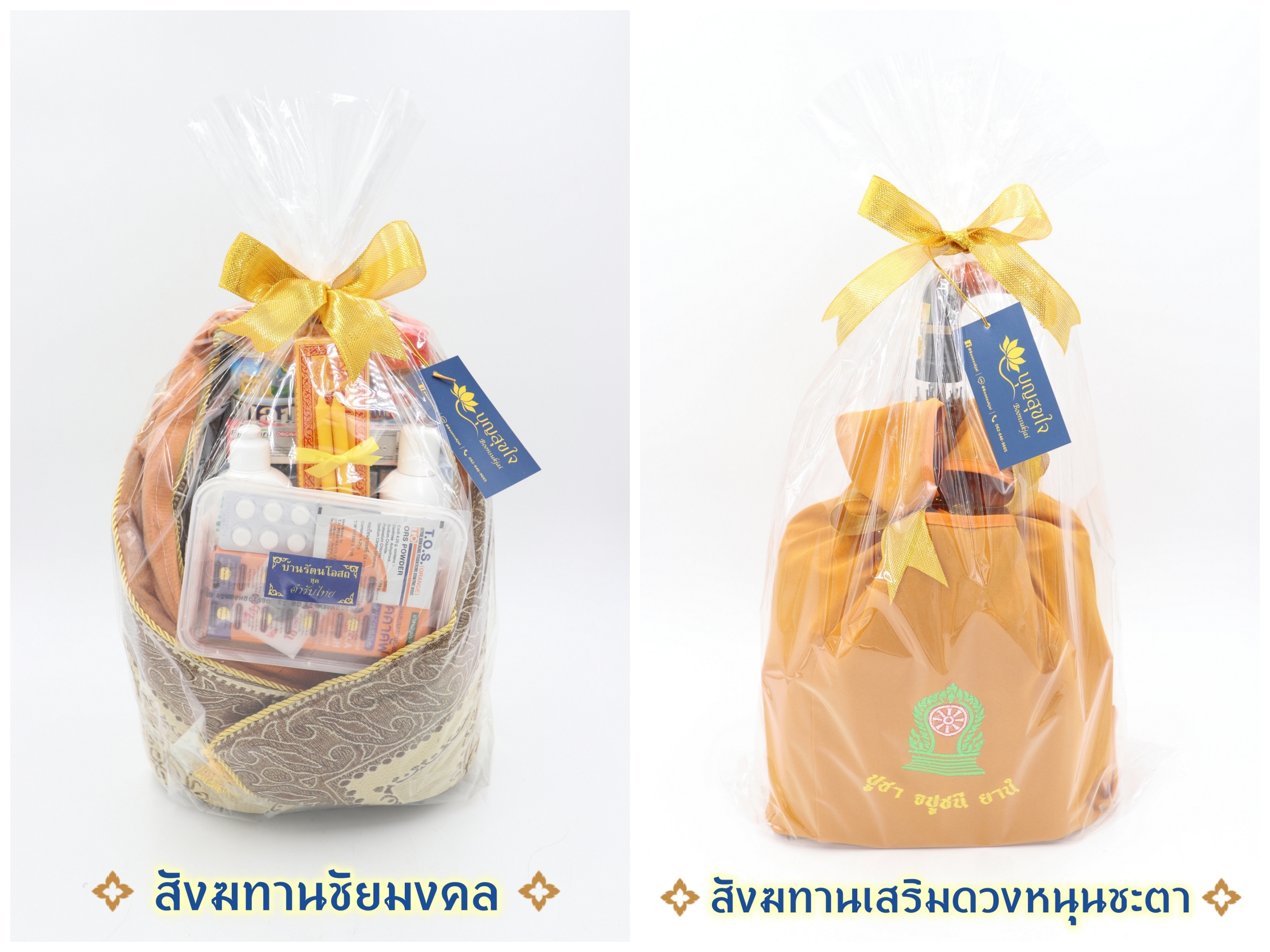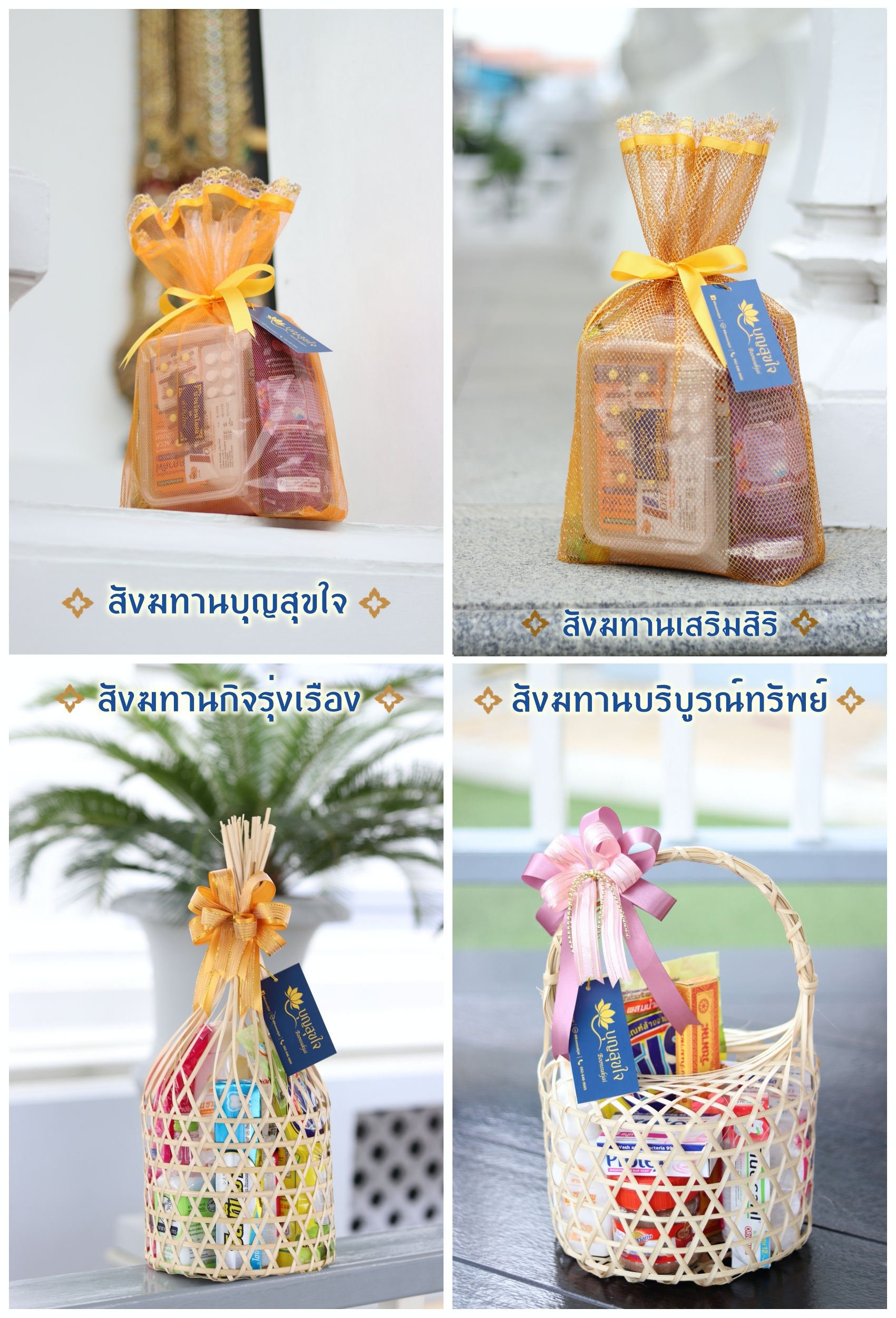 - สังฆทานของเราบรรจุของใช้เต็มหีบห่อทุกชุด ไม่หลอกลวง ผูกโบว์สวยงาม ทันสมัย และเลือกจัดตามธีมสีของลูกค้าได้